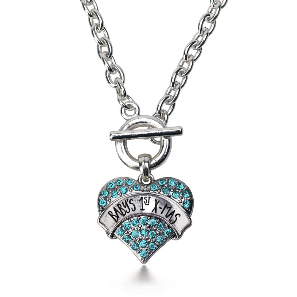 Our sparkling toggle necklace, equipped with a stylish toggle clasp and the Baby's 1st X-Mas Aqua aqua pave heart charm, is crafted from white metal with a silver plated finish and accented with cubic zirconia stones.