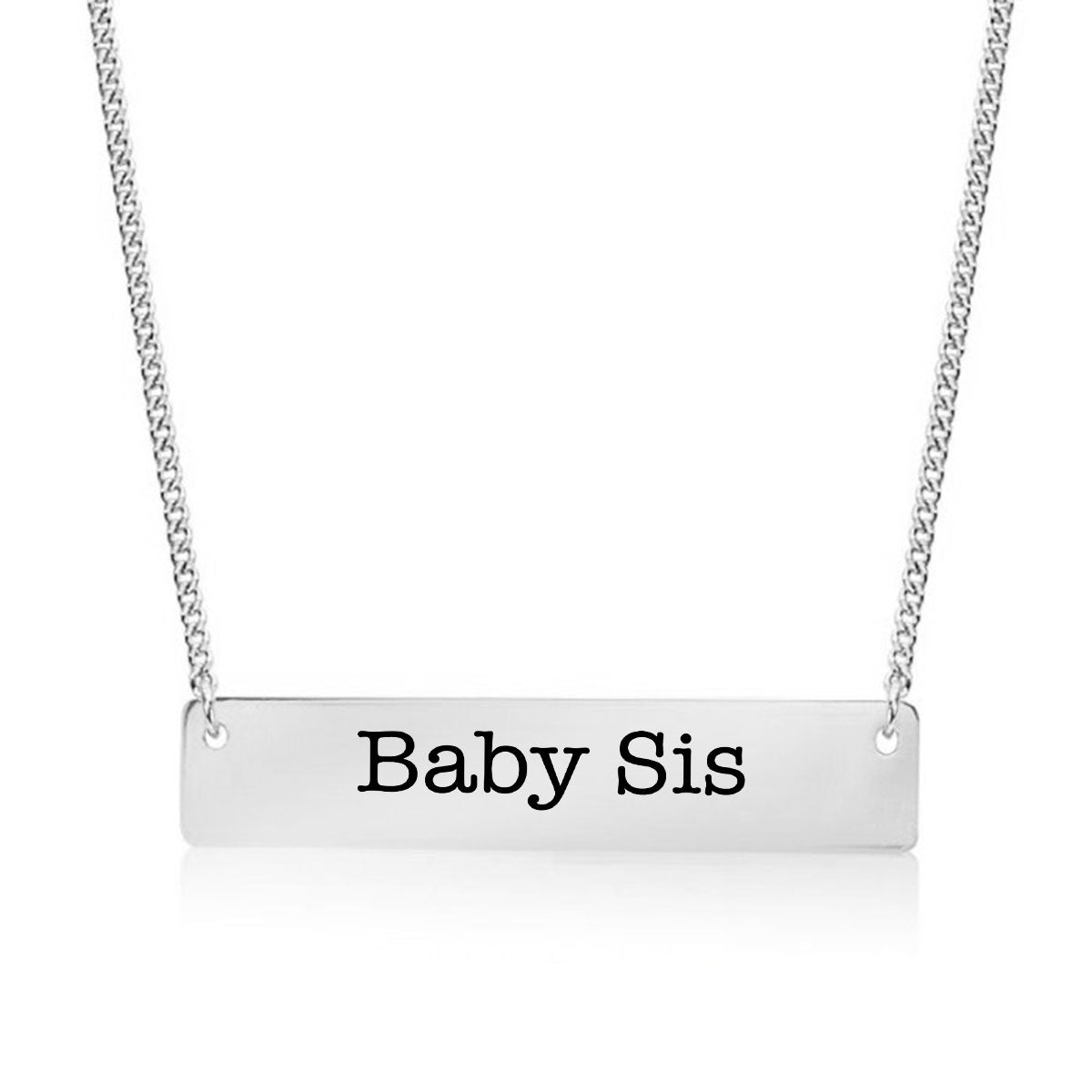 Our sparkling bar necklace, equipped with a stylish lobster claw clasp and the Baby Sis bar charm, is crafted from white metal with a silver plated finish.