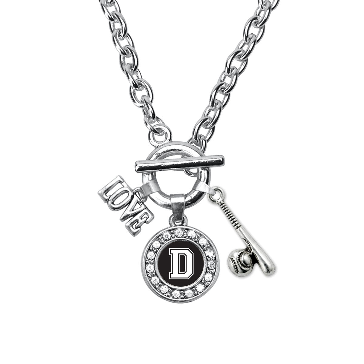 Our sparkling toggle necklace, equipped with a stylish toggle clasp and the Baseball Bat - Sports Initial D circle charm, is crafted from white metal with a silver plated finish and accented with cubic zirconia stones.