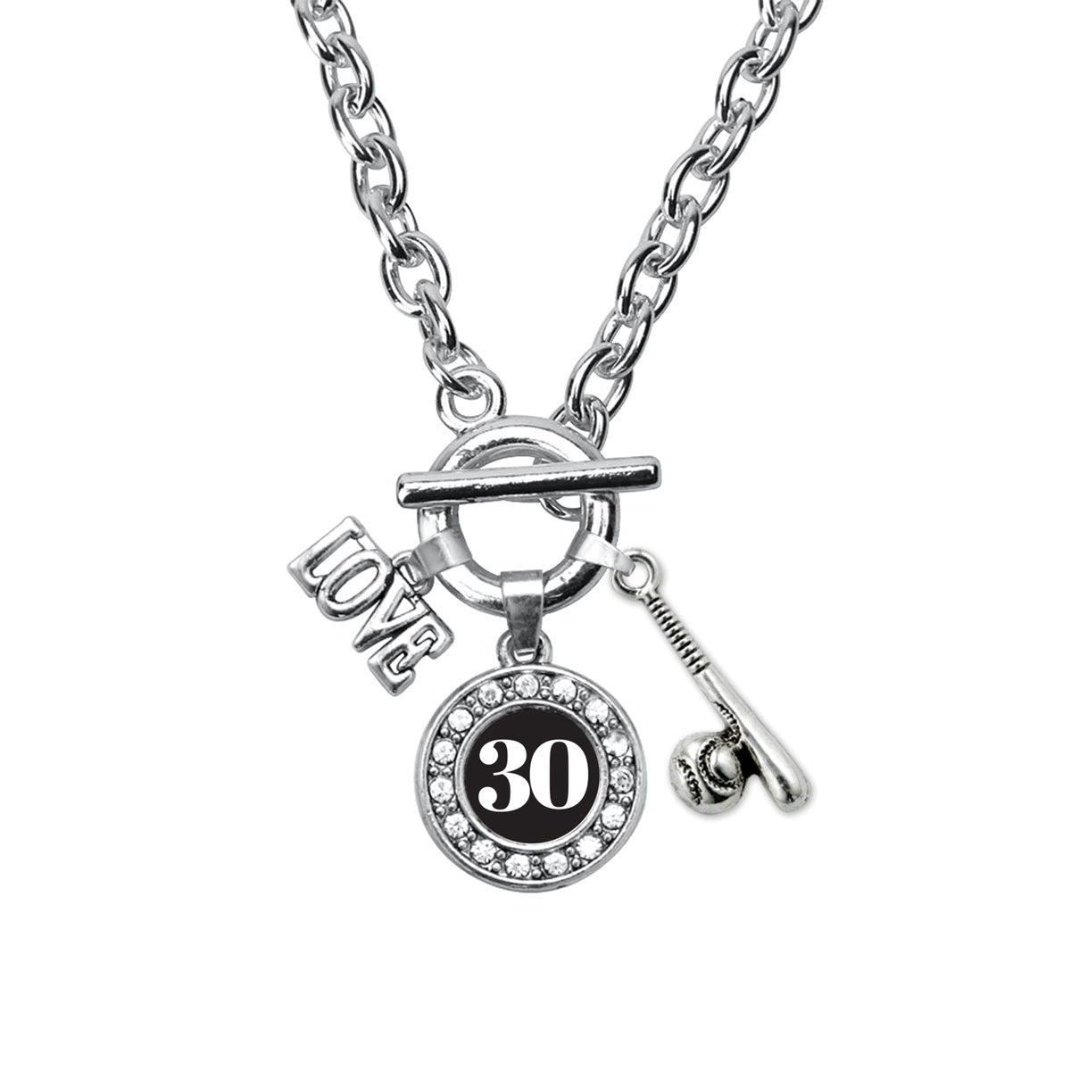 Our sparkling toggle necklace, equipped with a stylish toggle clasp and the Baseball Bat - Sports Number 30 circle charm, is crafted from white metal with a silver plated finish and accented with cubic zirconia stones.