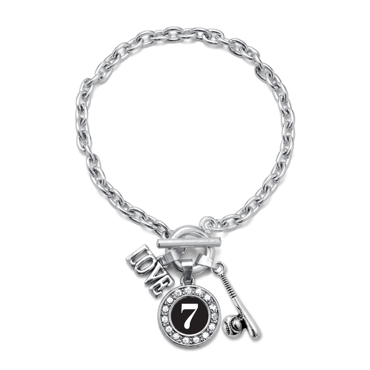 Our sparkling toggle bracelet, equipped with a stylish toggle clasp and the Baseball Bat - Sports Number 7 circle charm, is crafted from white metal with a silver plated finish and accented with cubic zirconia stones.