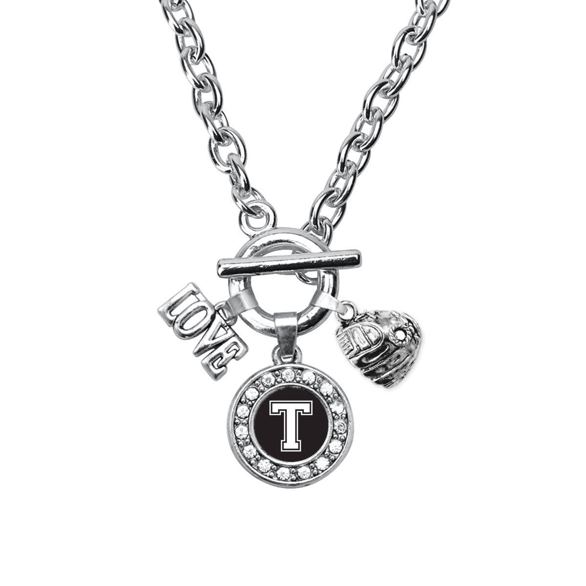 Our sparkling toggle necklace, equipped with a stylish toggle clasp and the Baseball Glove - Sports Initial T circle charm, is crafted from white metal with a silver plated finish and accented with cubic zirconia stones.