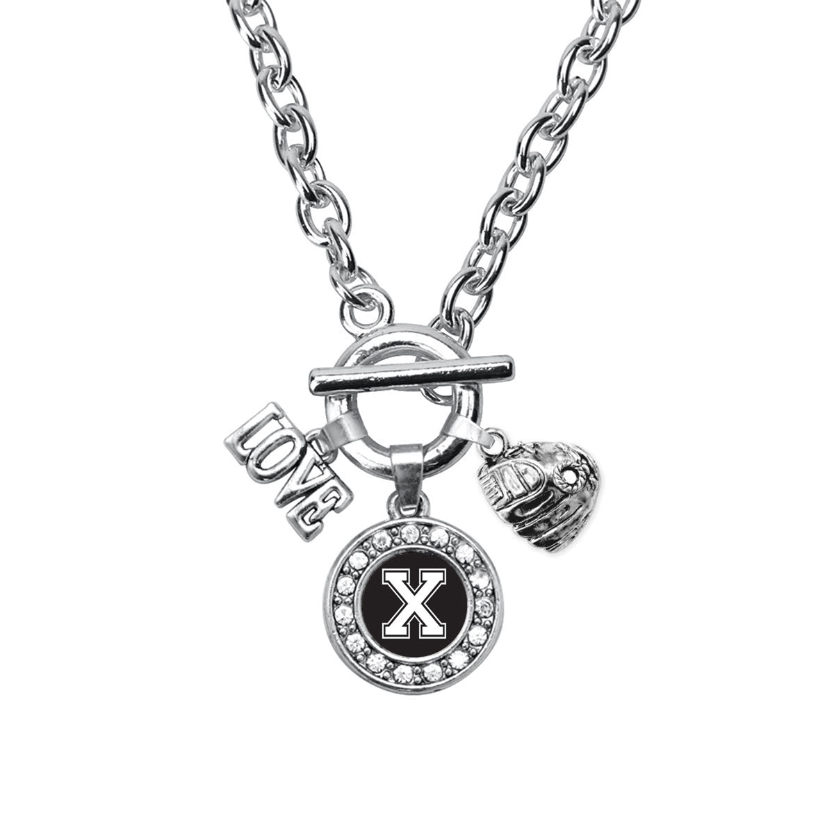 Our sparkling toggle necklace, equipped with a stylish toggle clasp and the Baseball Glove - Sports Initial X circle charm, is crafted from white metal with a silver plated finish and accented with cubic zirconia stones.