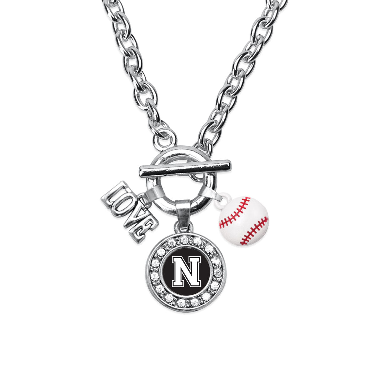 Our sparkling toggle necklace, equipped with a stylish toggle clasp and the Baseball - Sports Initial N circle charm, is crafted from white metal with a silver plated finish and accented with cubic zirconia stones.