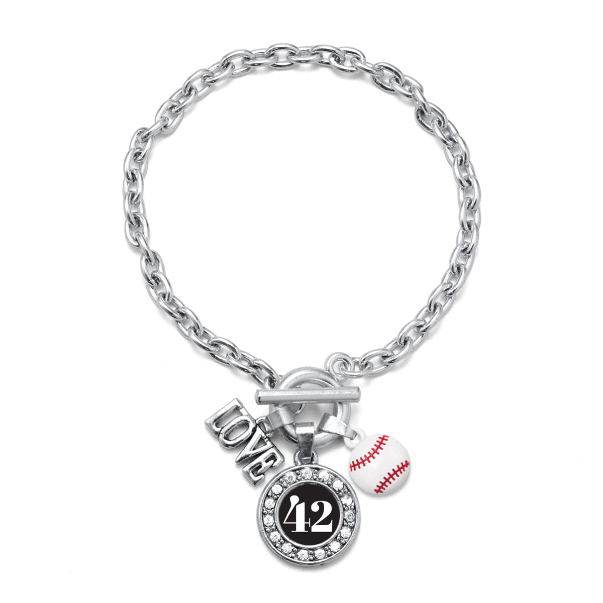 Our sparkling toggle bracelet, equipped with a stylish toggle clasp and the Baseball - Sports Number 42 circle charm, is crafted from white metal with a silver plated finish and accented with cubic zirconia stones.