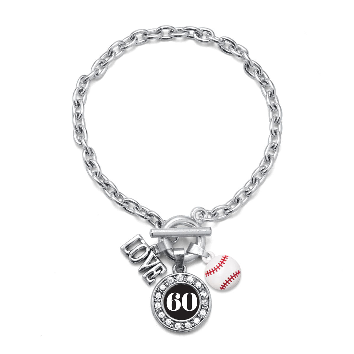 Our sparkling toggle bracelet, equipped with a stylish toggle clasp and the Baseball - Sports Number 60 circle charm, is crafted from white metal with a silver plated finish and accented with cubic zirconia stones.