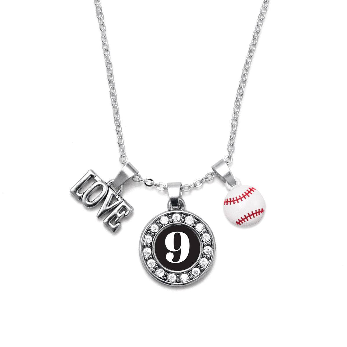 Our sparkling classic necklace, equipped with a stylish lobster claw clasp and the Baseball - Sports Number 9 circle charm, is crafted from white metal with a silver plated finish and accented with cubic zirconia stones.