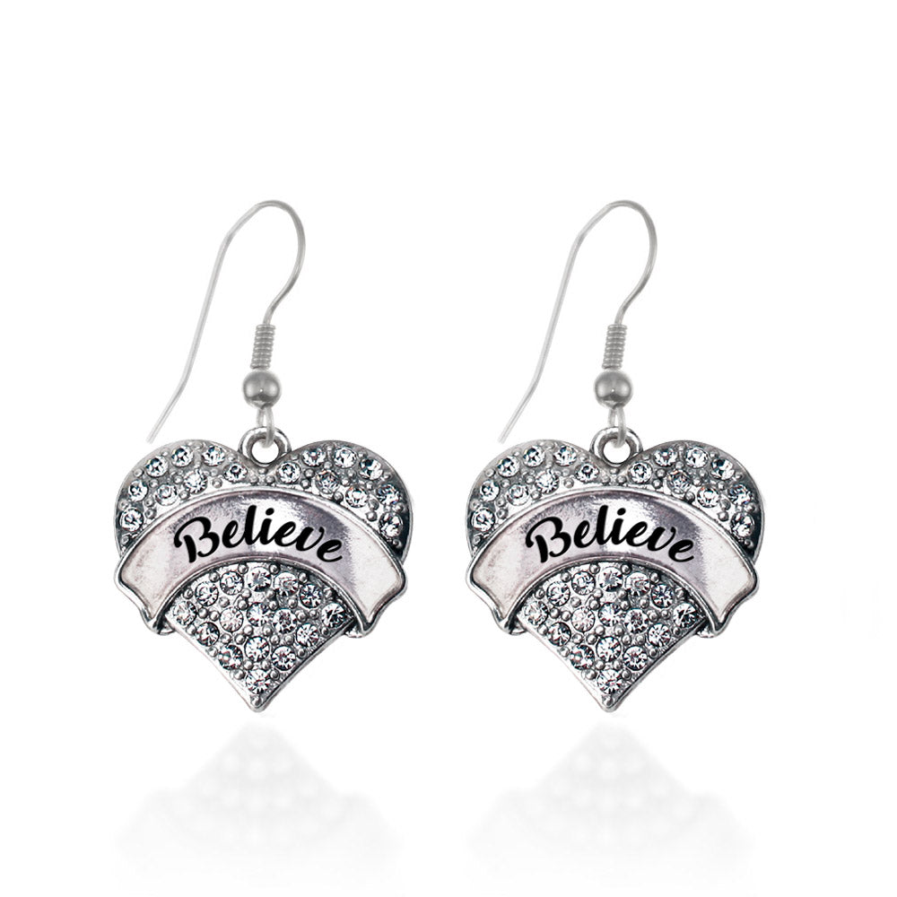 Our sparkling dangle earrings, equipped with a stylish french hook backing and the Believe pave heart charm, is crafted from white metal with a silver plated finish and accented with cubic zirconia stones.