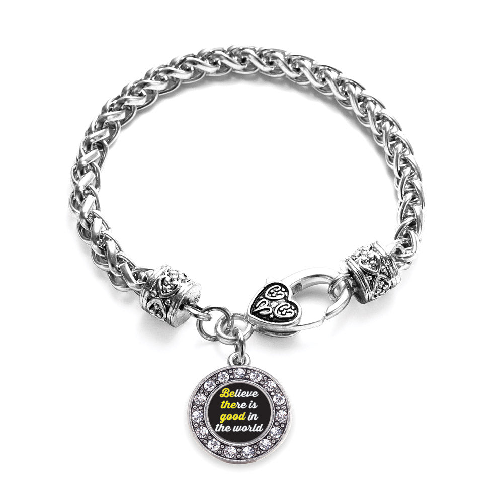 Our sparkling braided bracelet, equipped with a stylish lobster claw clasp and the Believe There Is Good In The World circle charm, is crafted from white metal with a silver plated finish and accented with cubic zirconia stones.