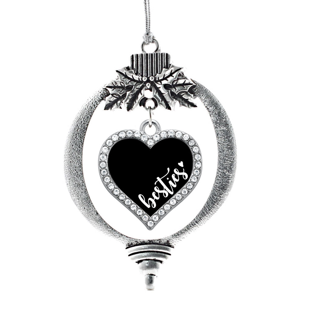 Our sparkling holiday ornament, equipped with a stylish silver rope and the Besties - Black open heart charm, is crafted from white metal with a silver plated finish and accented with cubic zirconia stones.