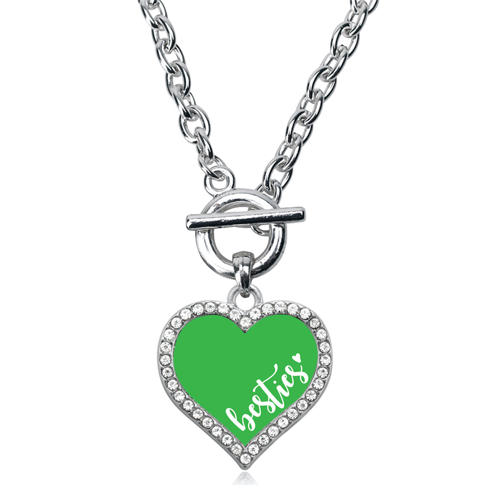 Our sparkling toggle necklace, equipped with a stylish toggle clasp and the Besties - Green open heart charm, is crafted from white metal with a silver plated finish and accented with cubic zirconia stones.