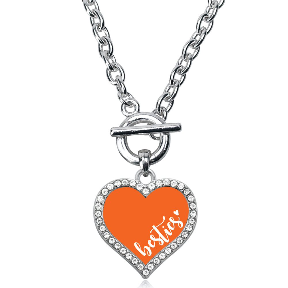 Our sparkling toggle necklace, equipped with a stylish toggle clasp and the Besties - Orange open heart charm, is crafted from white metal with a silver plated finish and accented with cubic zirconia stones.