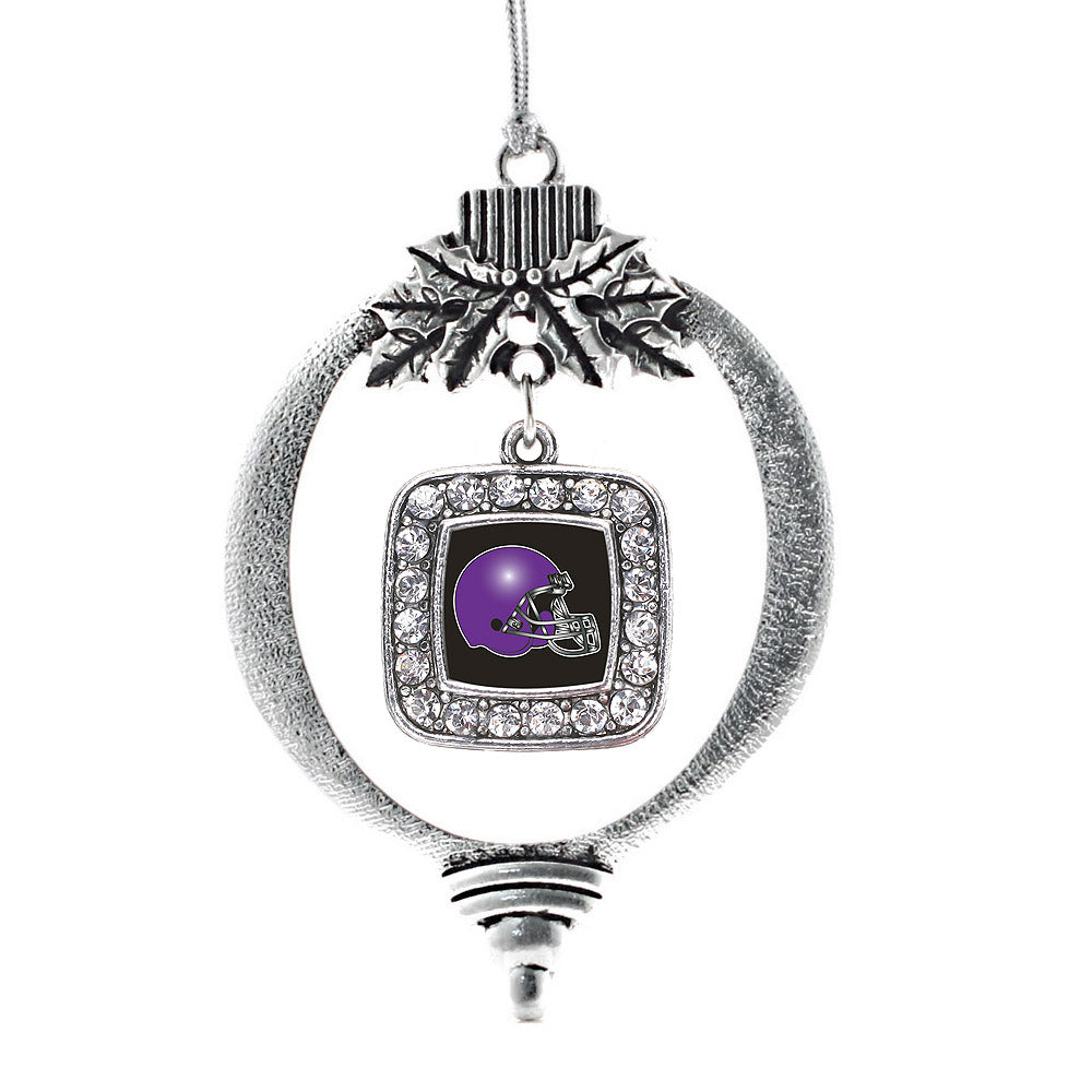Our sparkling holiday ornament, equipped with a stylish silver rope and the Black and Purple Team Helmet square charm, is crafted from white metal with a silver plated finish and accented with cubic zirconia stones.