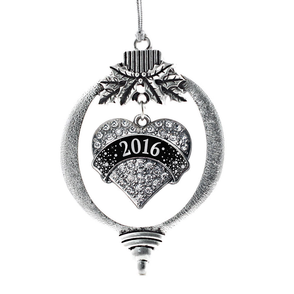 Our sparkling holiday ornament, equipped with a stylish silver rope and the Black and Silver 2016 pave heart charm, is crafted from white metal with a silver plated finish and accented with cubic zirconia stones.