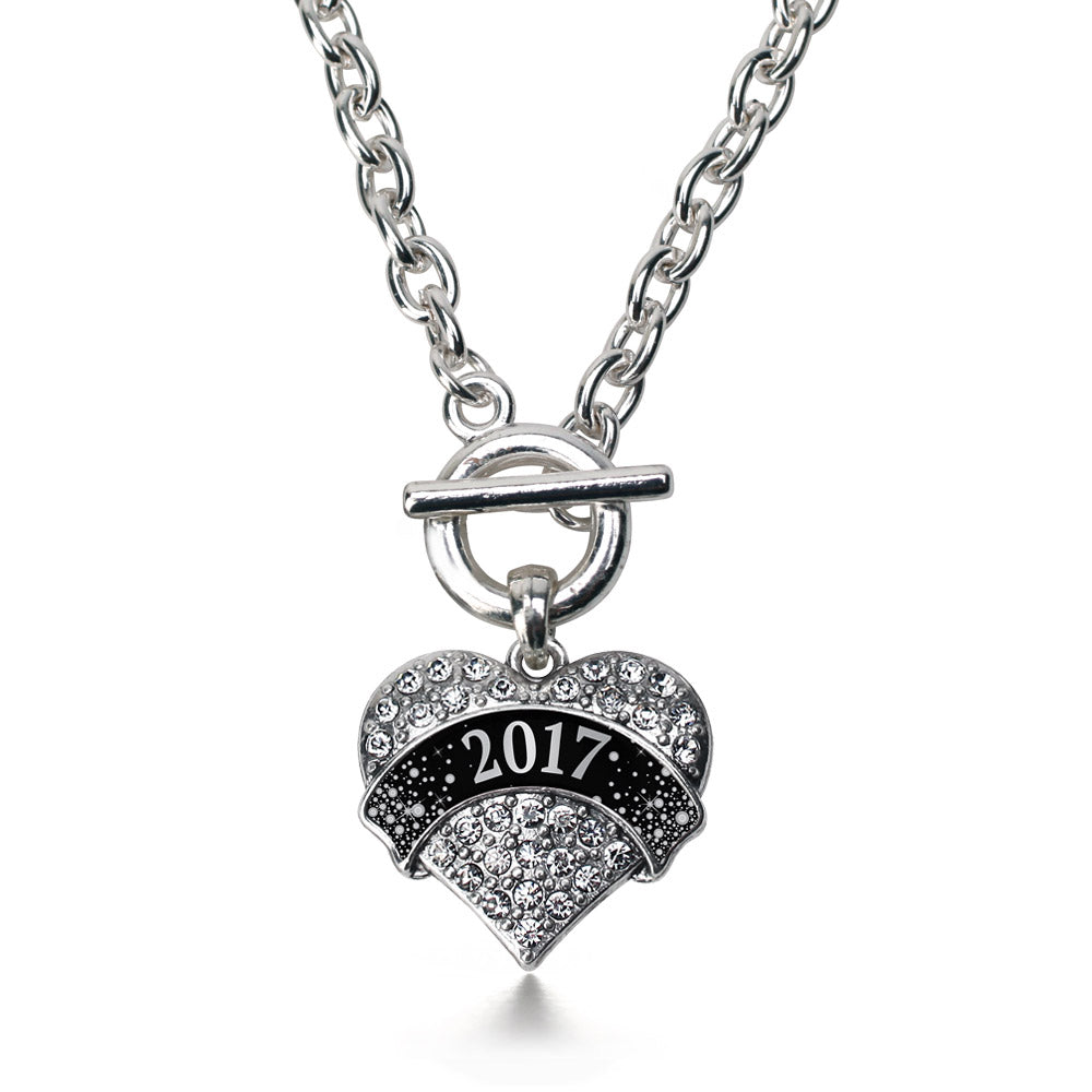 Our sparkling toggle necklace, equipped with a stylish toggle clasp and the Black and Silver 2017 pave heart charm, is crafted from white metal with a silver plated finish and accented with cubic zirconia stones.
