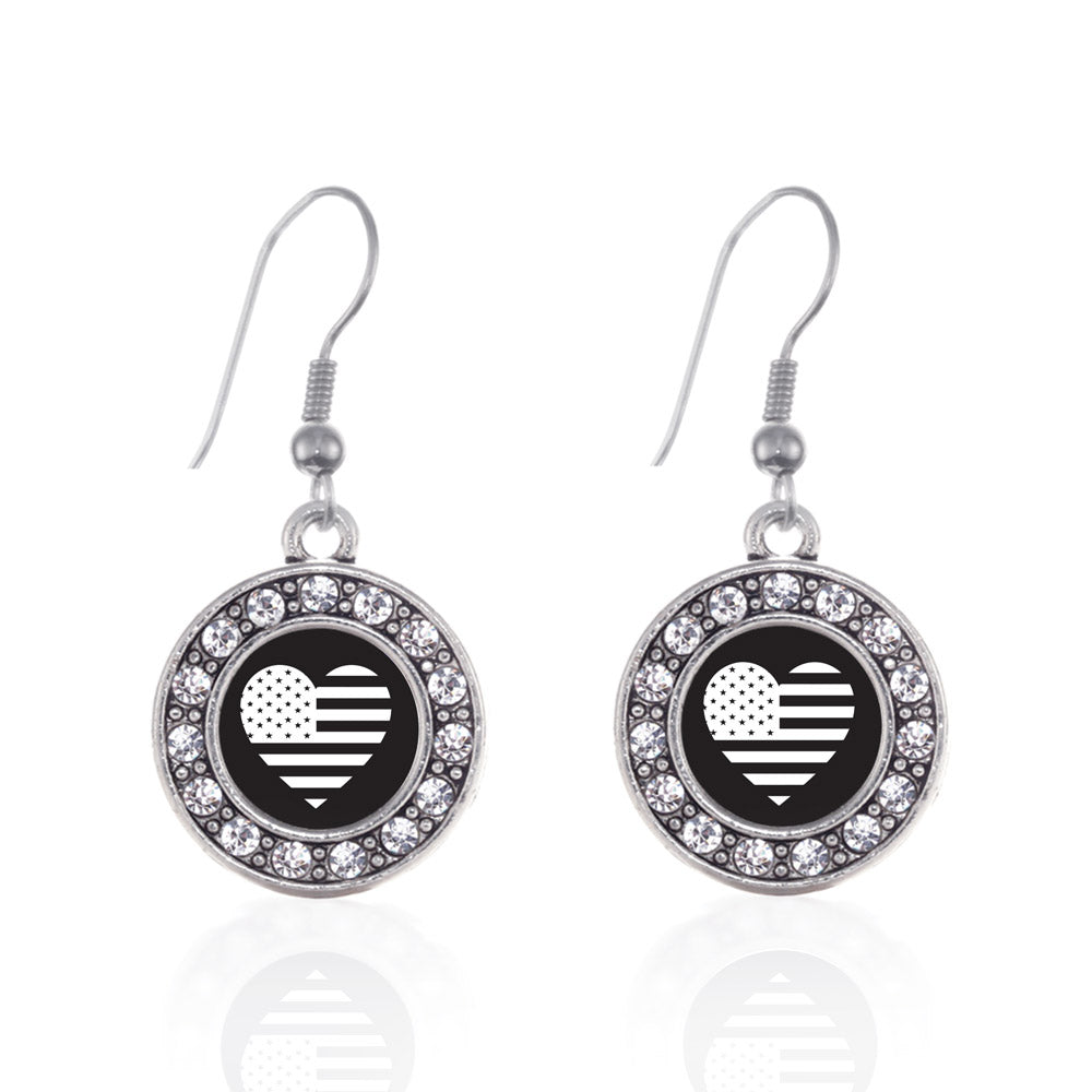 Our sparkling dangle earrings, equipped with a stylish french hook backing and the Black and White USA Flag Heart circle charm, is crafted from white metal with a silver plated finish and accented with cubic zirconia stones.
