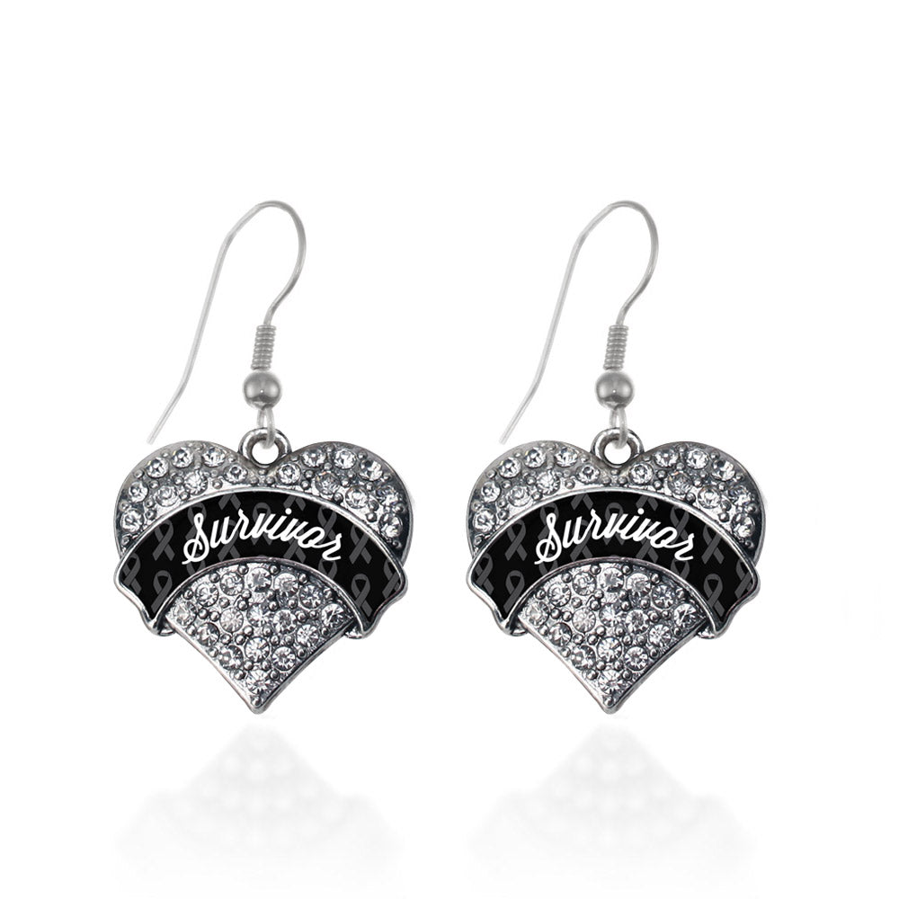 Silver Black Survivor Pave Heart Charm Dangle Earrings
