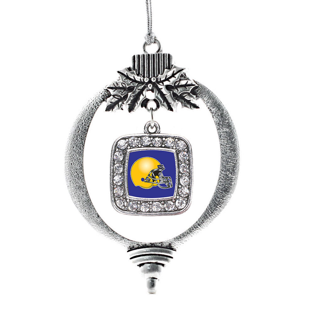 Our sparkling holiday ornament, equipped with a stylish silver rope and the Blue and Yellow Team Helmet square charm, is crafted from white metal with a silver plated finish and accented with cubic zirconia stones.