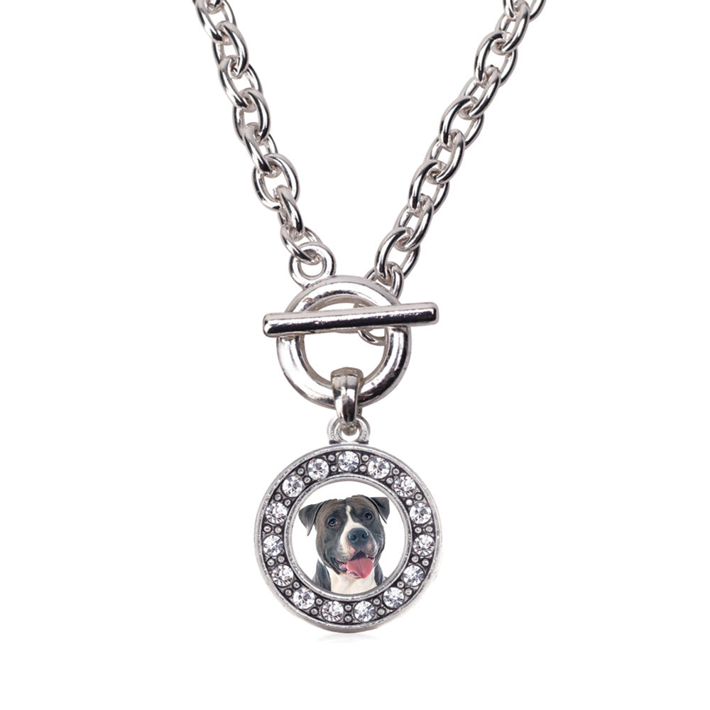 Our sparkling toggle necklace, equipped with a stylish toggle clasp and the Blue Pit Bull circle charm, is crafted from white metal with a silver plated finish and accented with cubic zirconia stones.
