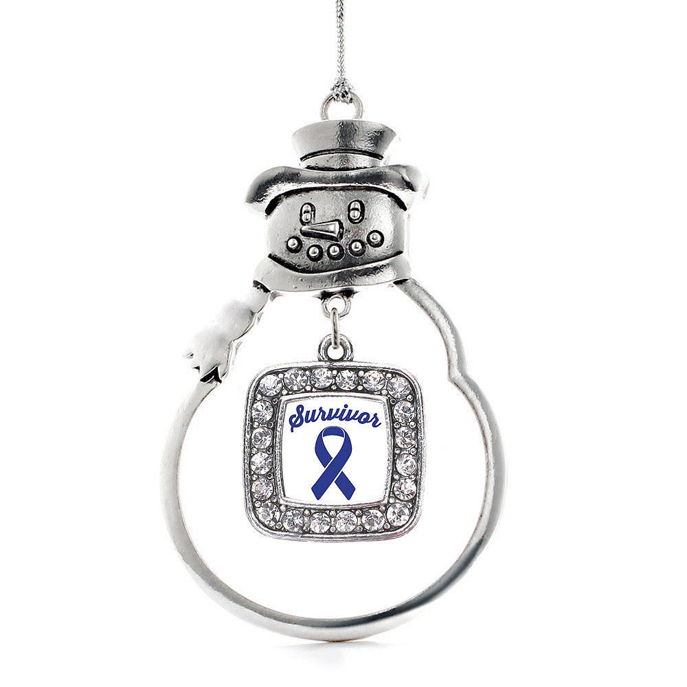 Our sparkling snowman ornament, equipped with a stylish silver rope and the Blue Ribbon Survivor square charm, is crafted from white metal with a silver plated finish and accented with cubic zirconia stones.