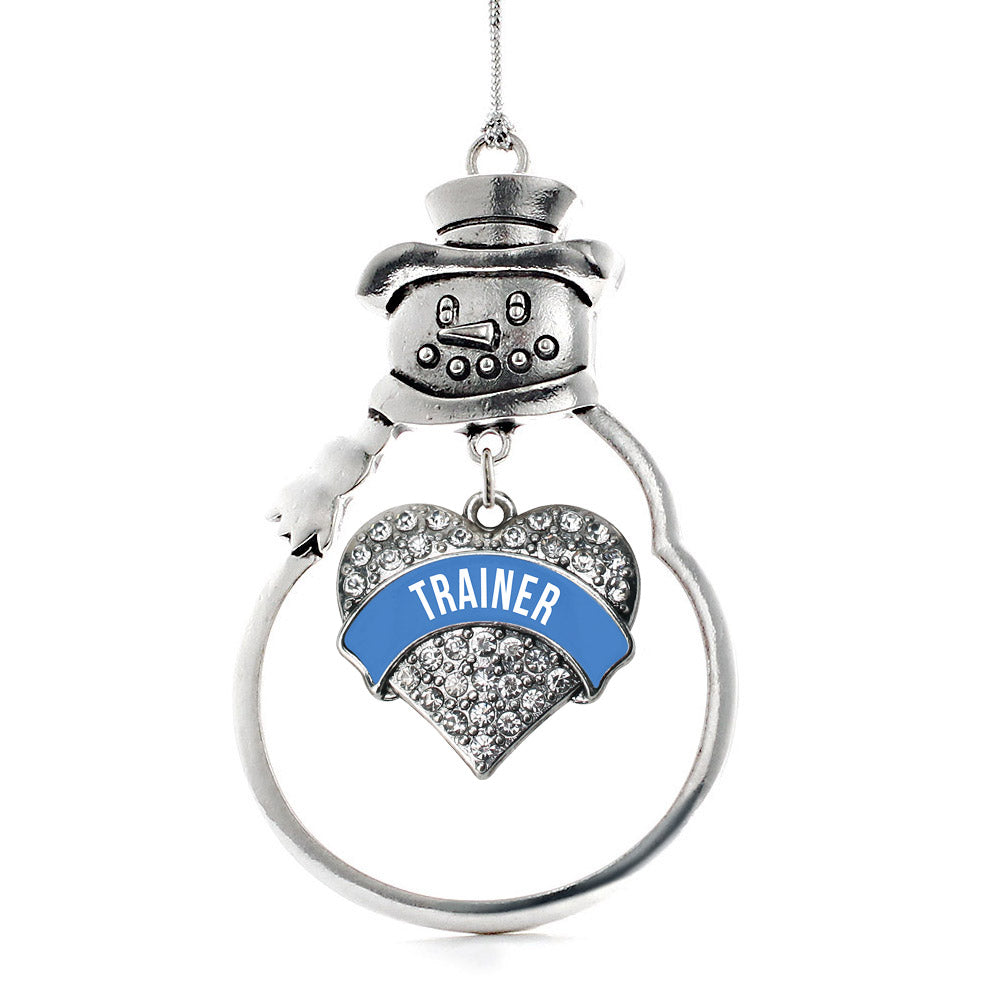 Our sparkling snowman ornament, equipped with a stylish silver rope and the Blue Trainer pave heart charm, is crafted from white metal with a silver plated finish and accented with cubic zirconia stones.