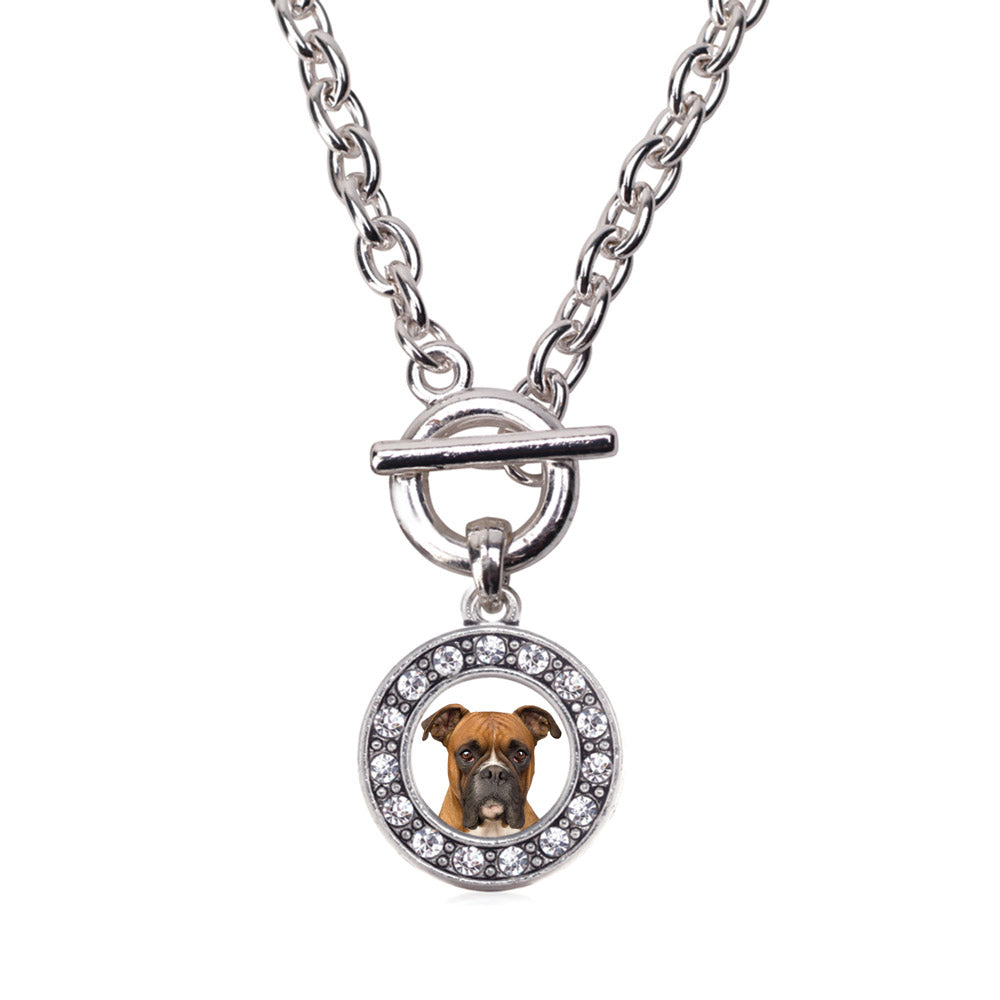 Our sparkling toggle necklace, equipped with a stylish toggle clasp and the Boxer Face circle charm, is crafted from white metal with a silver plated finish and accented with cubic zirconia stones.
