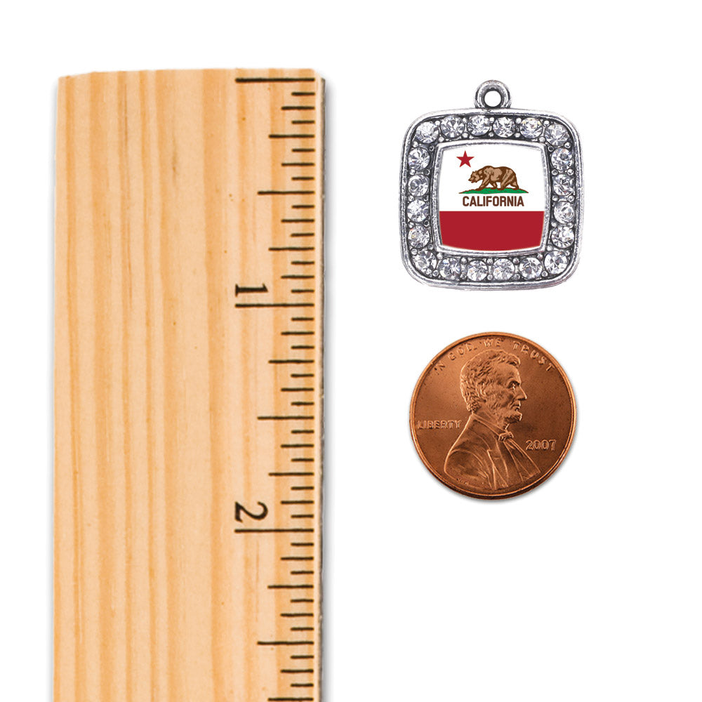 Our sparkling holiday ornament, equipped with a stylish silver rope and the California Flag square charm, is crafted from white metal with a silver plated finish and accented with cubic zirconia stones.