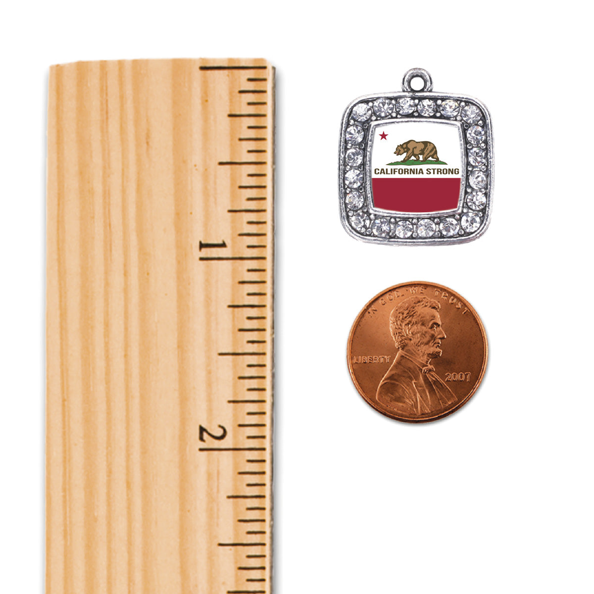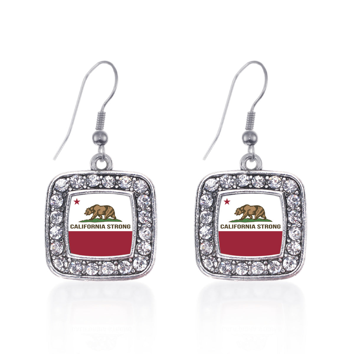 Our sparkling dangle earrings, equipped with a stylish french hook backing and the California Strong Flag square charm, is crafted from white metal with a silver plated finish and accented with cubic zirconia stones.
