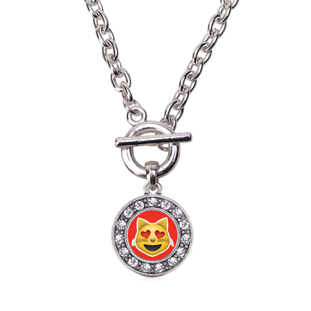 Silver Cat Heart Emoji Circle Charm Toggle Necklace