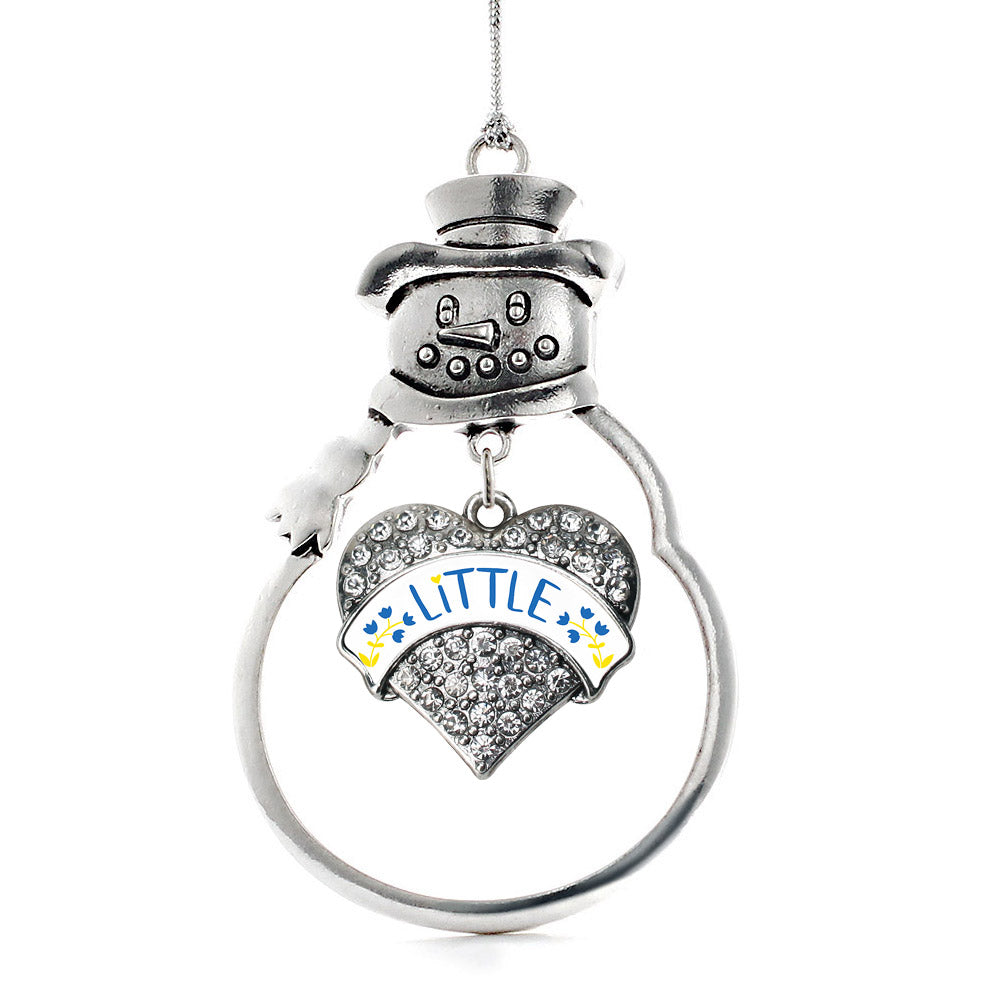 Our sparkling snowman ornament, equipped with a stylish silver rope and the Cerulean Blue and Canary Yellow Little pave heart charm, is crafted from white metal with a silver plated finish and accented with cubic zirconia stones.