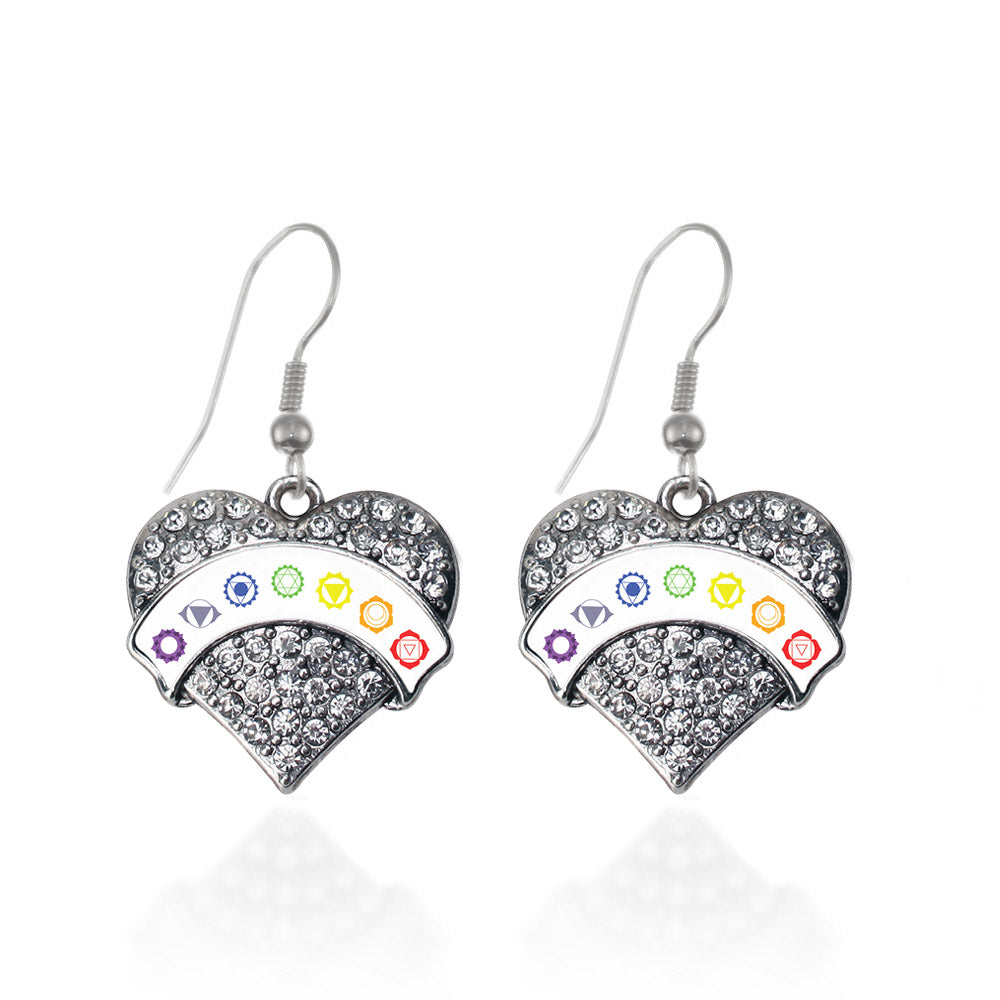 Our sparkling dangle earrings, equipped with a stylish french hook backing and the Chakra Symbols - White Banner pave heart charm, is crafted from white metal with a silver plated finish and accented with cubic zirconia stones.