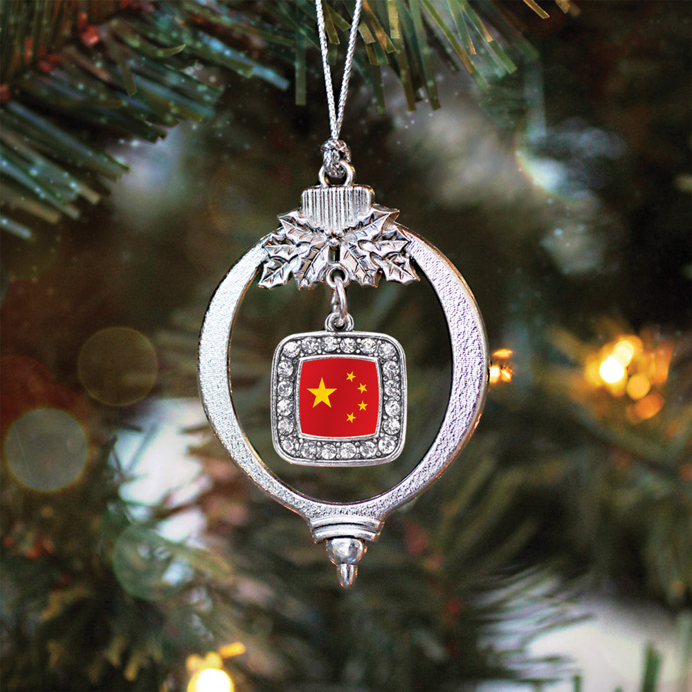 Our sparkling holiday ornament, equipped with a stylish silver rope and the China Flag square charm, is crafted from white metal with a silver plated finish and accented with cubic zirconia stones.