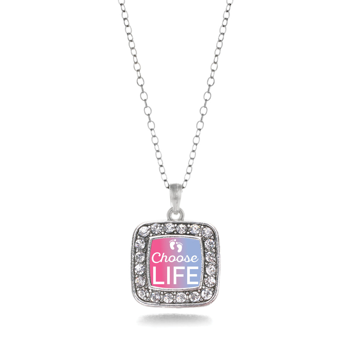 Our sparkling classic necklace, equipped with a stylish lobster claw clasp and the Choose Life square charm, is crafted from white metal with a silver plated finish and accented with cubic zirconia stones.
