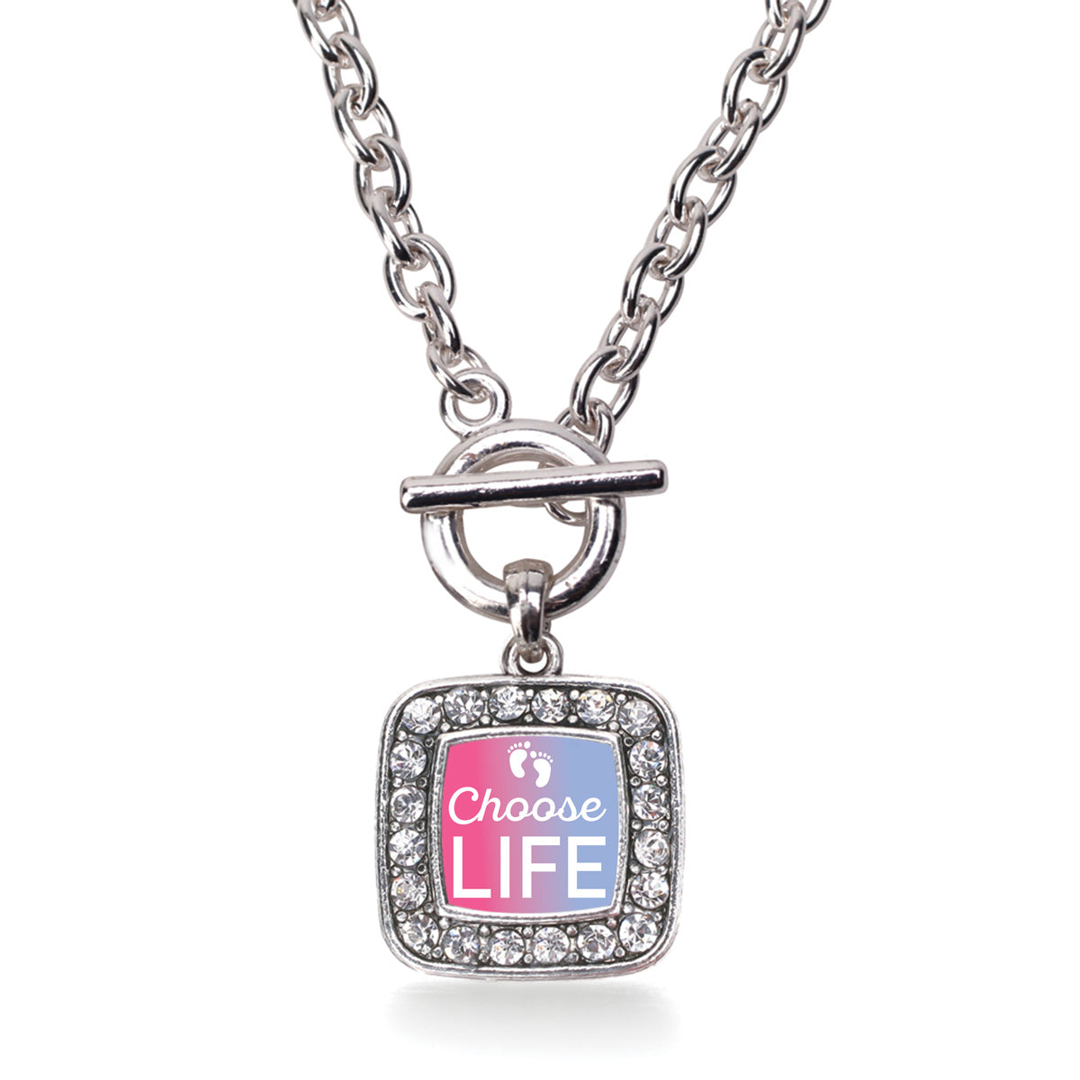 Our sparkling toggle necklace, equipped with a stylish toggle clasp and the Choose Life square charm, is crafted from white metal with a silver plated finish and accented with cubic zirconia stones.