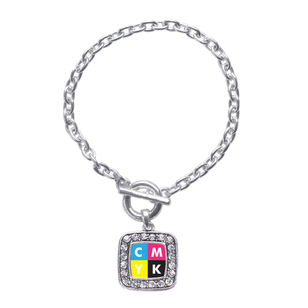 Our sparkling toggle bracelet, equipped with a stylish toggle clasp and the CMYK square charm, is crafted from white metal with a silver plated finish and accented with cubic zirconia stones.