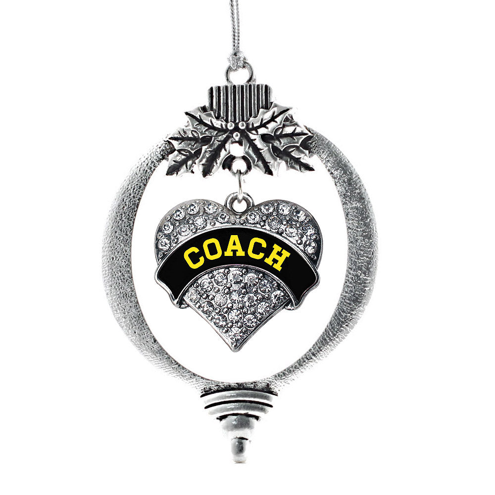 Our sparkling holiday ornament, equipped with a stylish silver rope and the Coach - Black and Yellow pave heart charm, is crafted from white metal with a silver plated finish and accented with cubic zirconia stones.