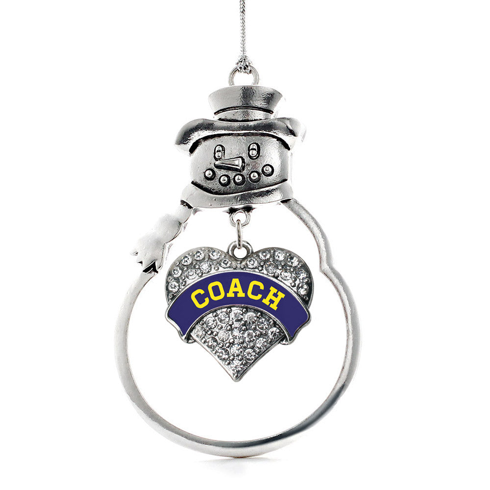Our sparkling snowman ornament, equipped with a stylish silver rope and the Coach - Navy Blue and Yellow pave heart charm, is crafted from white metal with a silver plated finish and accented with cubic zirconia stones.