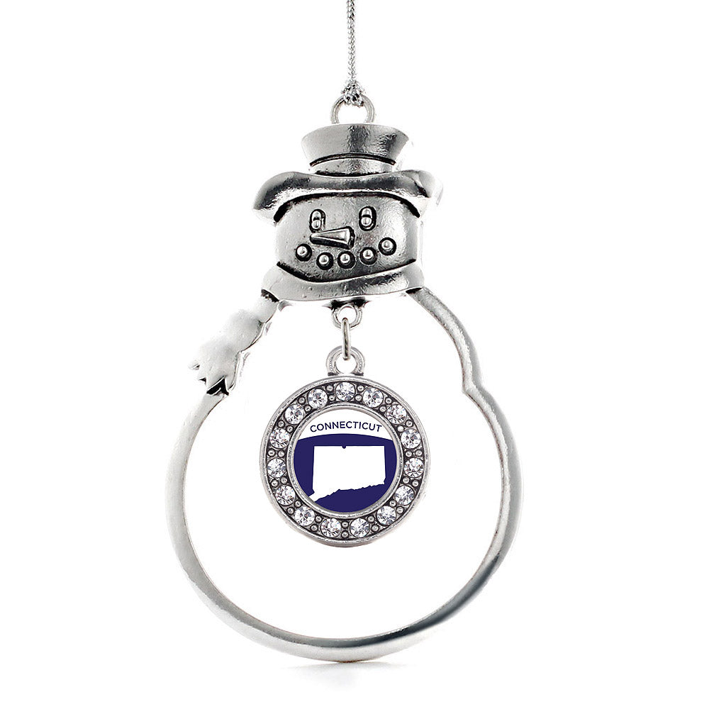 Our sparkling snowman ornament, equipped with a stylish silver rope and the Connecticut Outline circle charm, is crafted from white metal with a silver plated finish and accented with cubic zirconia stones.