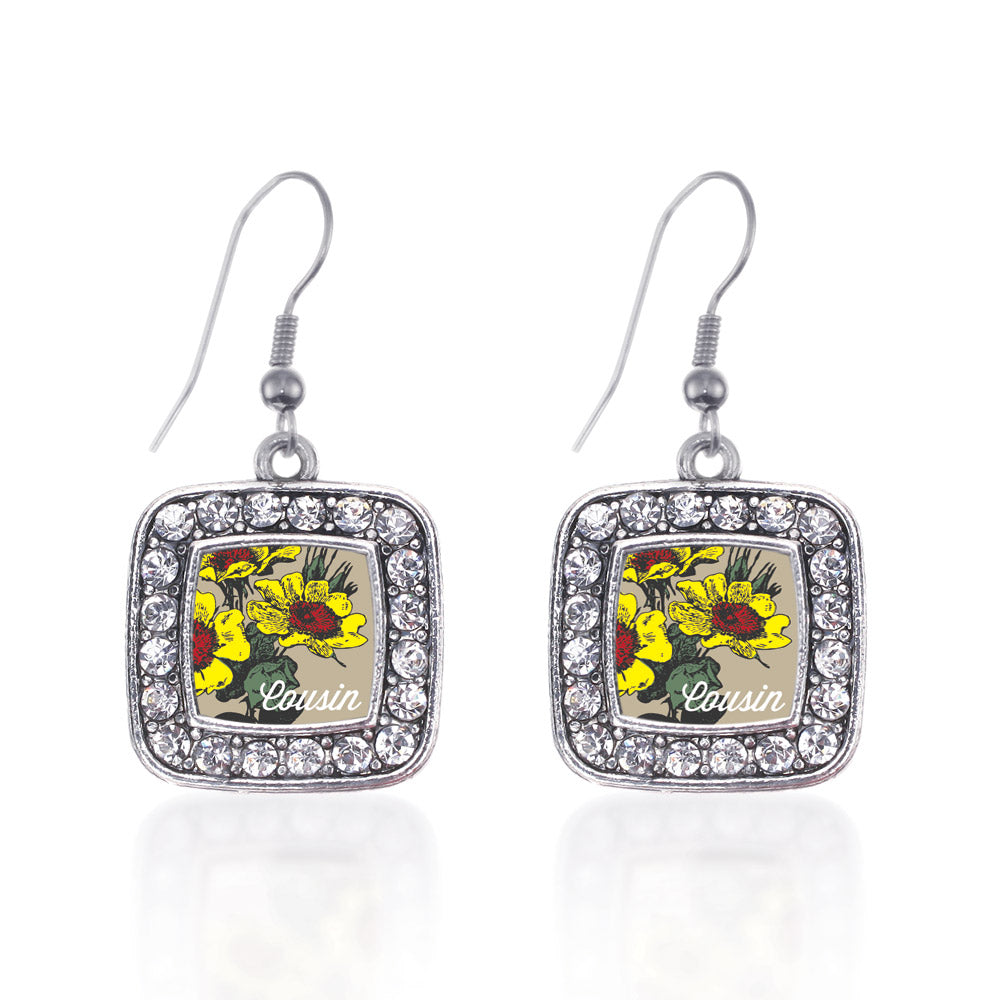 Silver Cousin Coreopsis Flower Square Charm Dangle Earrings