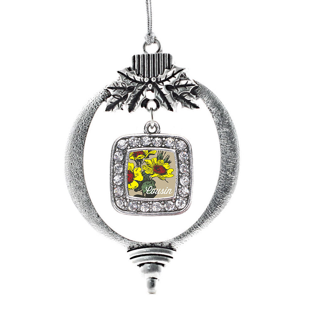 Our sparkling holiday ornament, equipped with a stylish silver rope and the Cousin Coreopsis Flower square charm, is crafted from white metal with a silver plated finish and accented with cubic zirconia stones.