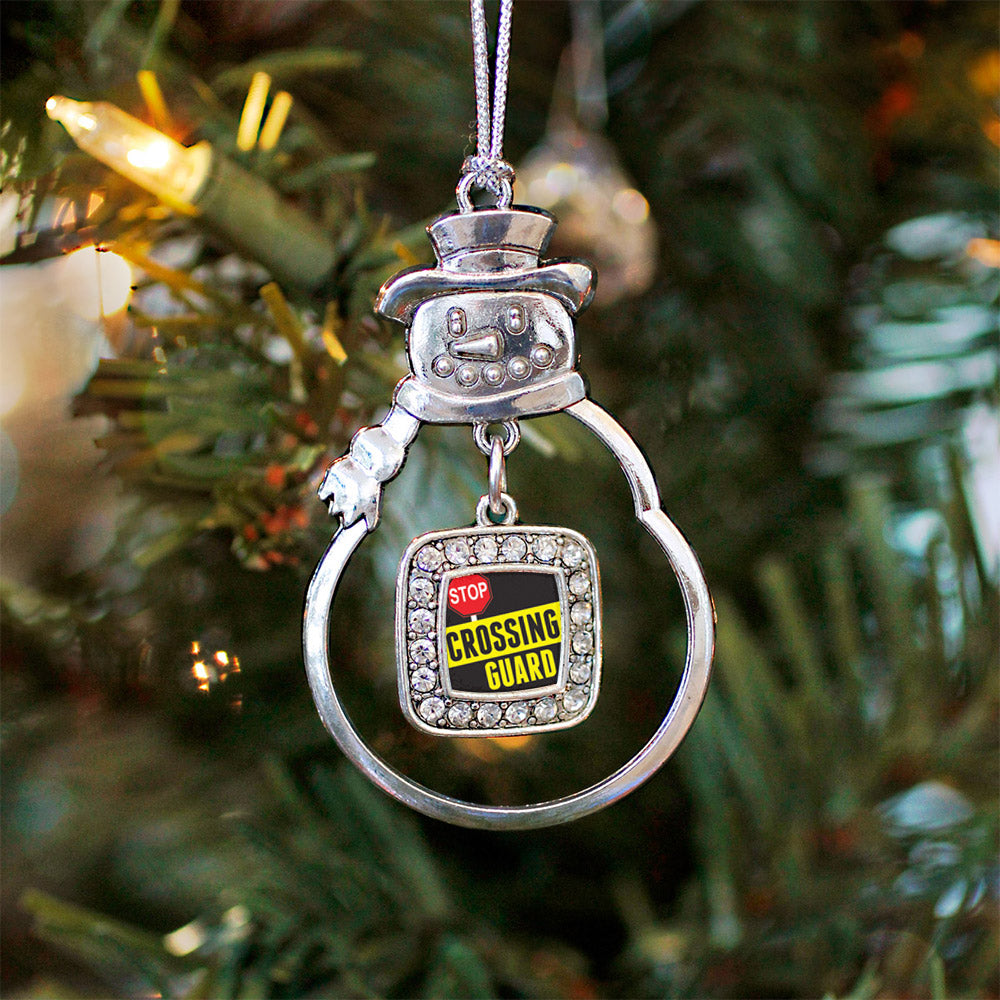 Our sparkling snowman ornament, equipped with a stylish silver rope and the Crossing Guard square charm, is crafted from white metal with a silver plated finish and accented with cubic zirconia stones.