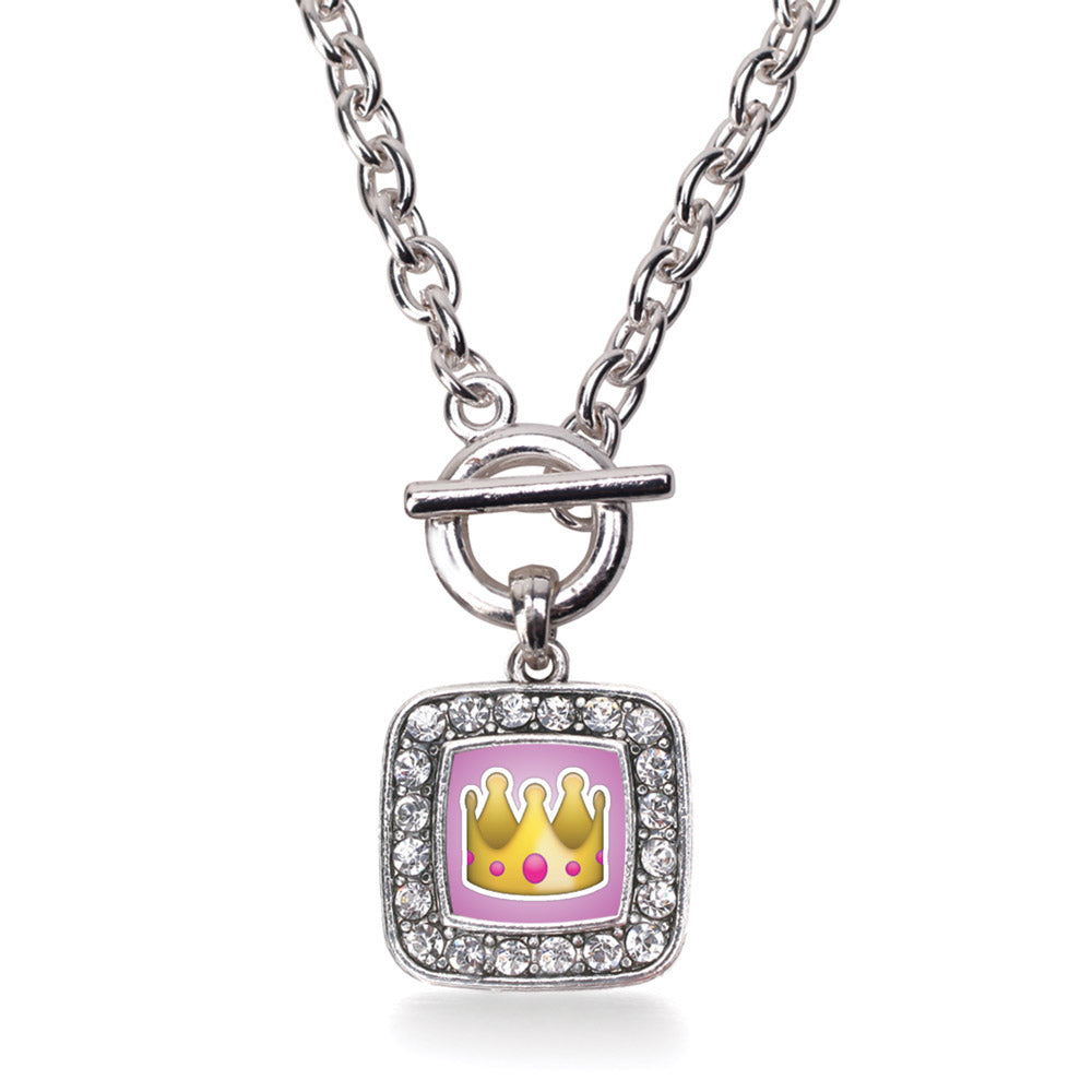 Our sparkling toggle necklace, equipped with a stylish toggle clasp and the Crown Emoji square charm, is crafted from white metal with a silver plated finish and accented with cubic zirconia stones.