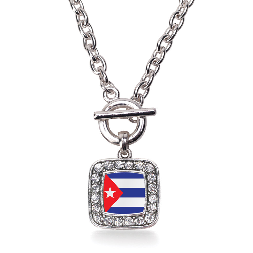 Our sparkling toggle necklace, equipped with a stylish toggle clasp and the Cuba Flag square charm, is crafted from white metal with a silver plated finish and accented with cubic zirconia stones.