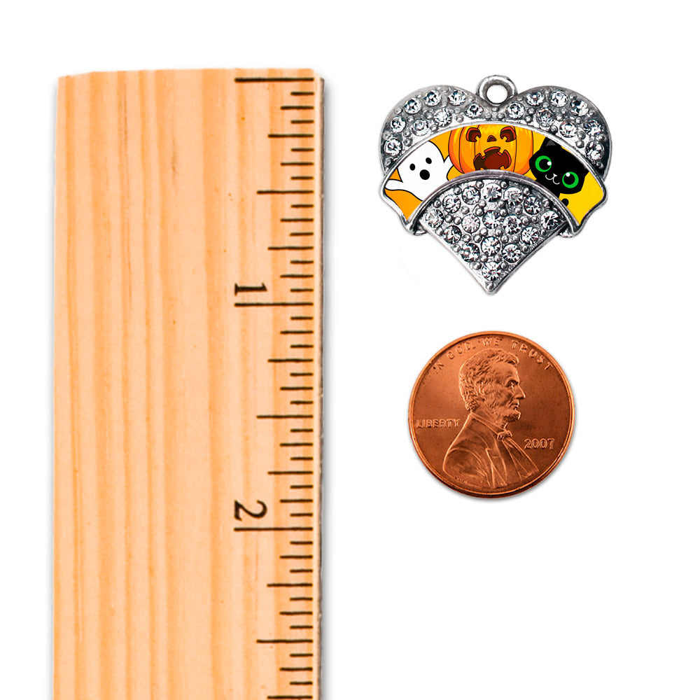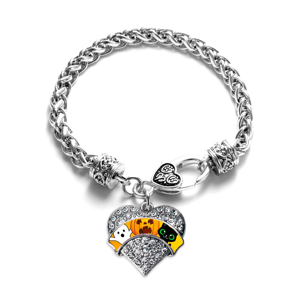 Our sparkling braided bracelet, equipped with a stylish lobster claw clasp and the Cute Halloween Trio pave heart charm, is crafted from white metal with a silver plated finish and accented with cubic zirconia stones.