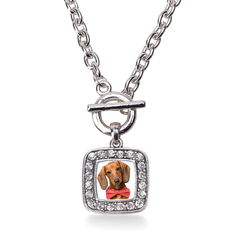 Our sparkling toggle necklace, equipped with a stylish toggle clasp and the Dachshund Face square charm, is crafted from white metal with a silver plated finish and accented with cubic zirconia stones.