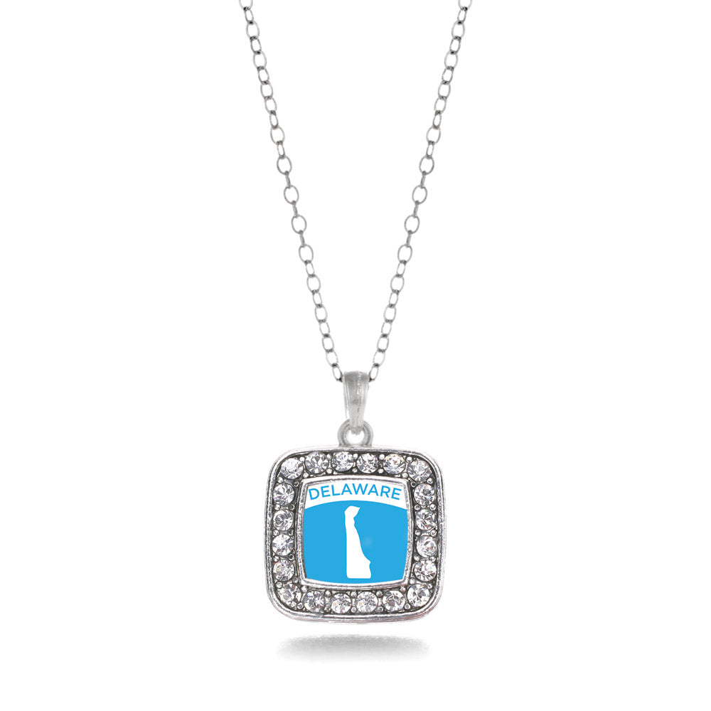 Our sparkling classic necklace, equipped with a stylish lobster claw clasp and the Delaware Outline square charm, is crafted from white metal with a silver plated finish and accented with cubic zirconia stones.