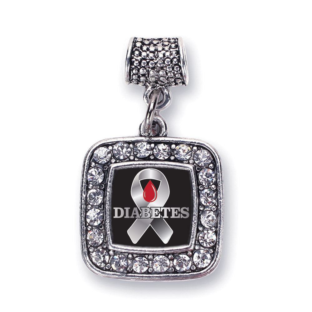 Our sparkling memory charm, equipped with a stylish charm attachment ring and the Diabetes Awareness square charm, is crafted from white metal with a silver plated finish and accented with cubic zirconia stones.