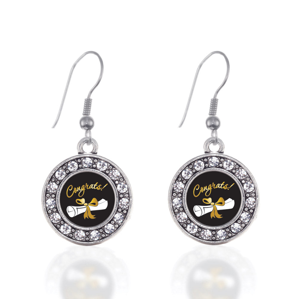 Our sparkling dangle earrings, equipped with a stylish french hook backing and the Diploma circle charm, is crafted from white metal with a silver plated finish and accented with cubic zirconia stones.
