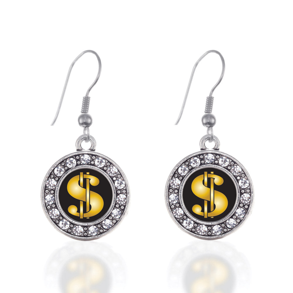 Our sparkling dangle earrings, equipped with a stylish french hook backing and the Dollar Sign circle charm, is crafted from white metal with a silver plated finish and accented with cubic zirconia stones.