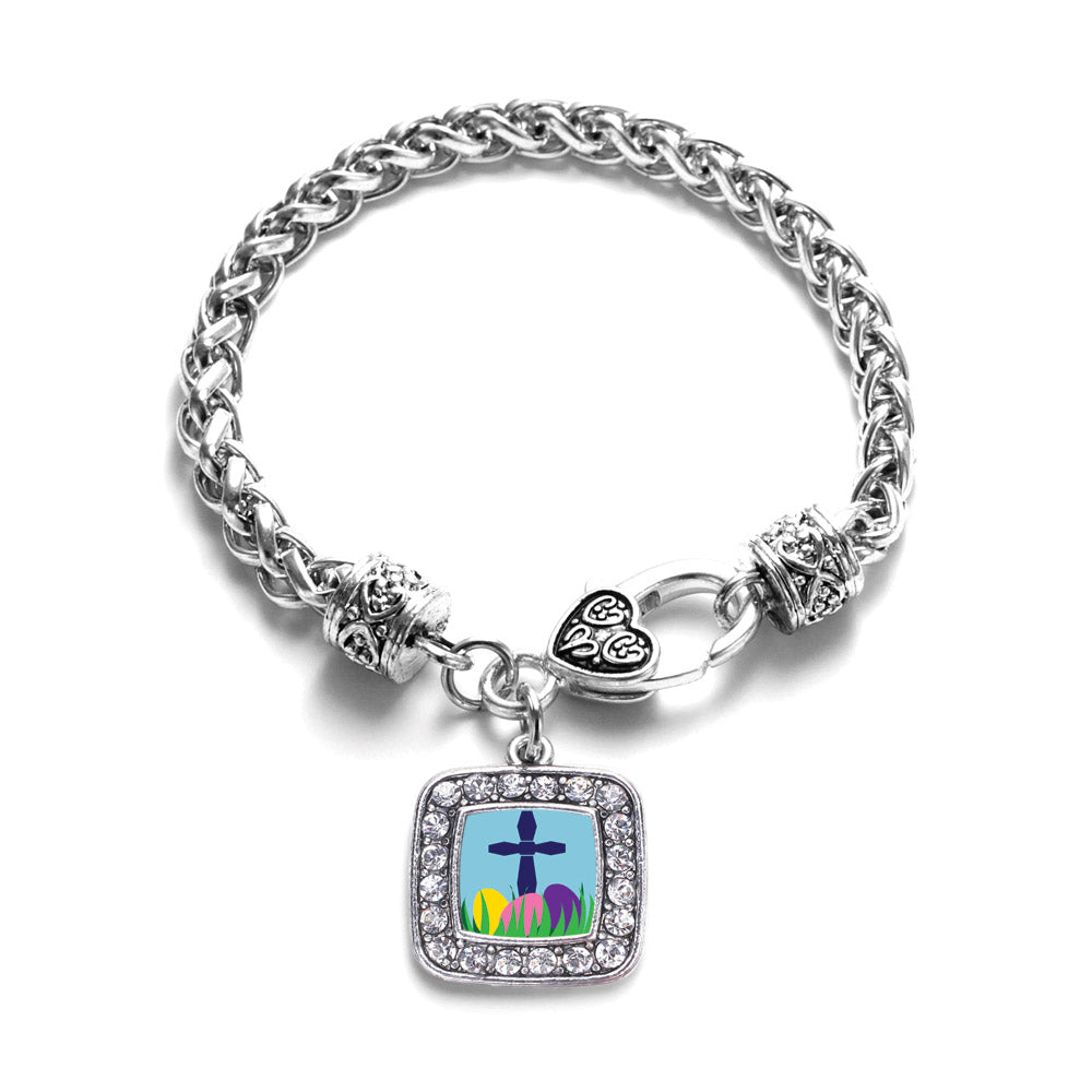 Our sparkling braided bracelet, equipped with a stylish lobster claw clasp and the Easter Cross & Eggs square charm, is crafted from white metal with a silver plated finish and accented with cubic zirconia stones.